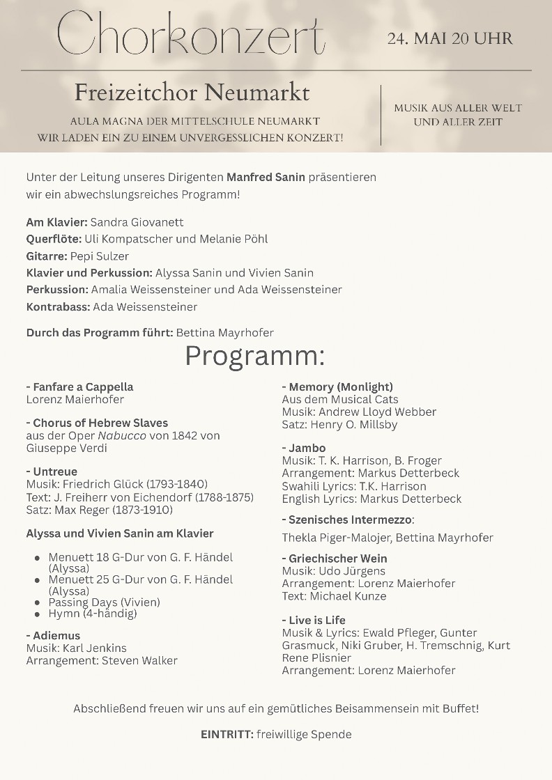 Mit dieser klangstarken Vokalkomposition eröffnet Lorenz Mayrhofer das Konzert auf besondere Weise: ganz ohne Instrumente – nur mit Stimmen. Die „Fanfare a cappella“ lebt von rhythmischer Genauigkeit, klarer Struktur und der Wirkung mehrstimmiger Harmonie. Mayrhofer gelingt es, die Form der klassischen Fanfare in ein modernes, vokales Gewand zu kleiden. Ein eindrucksvoller Auftakt – allein durch die Kraft der menschlichen Stimme.